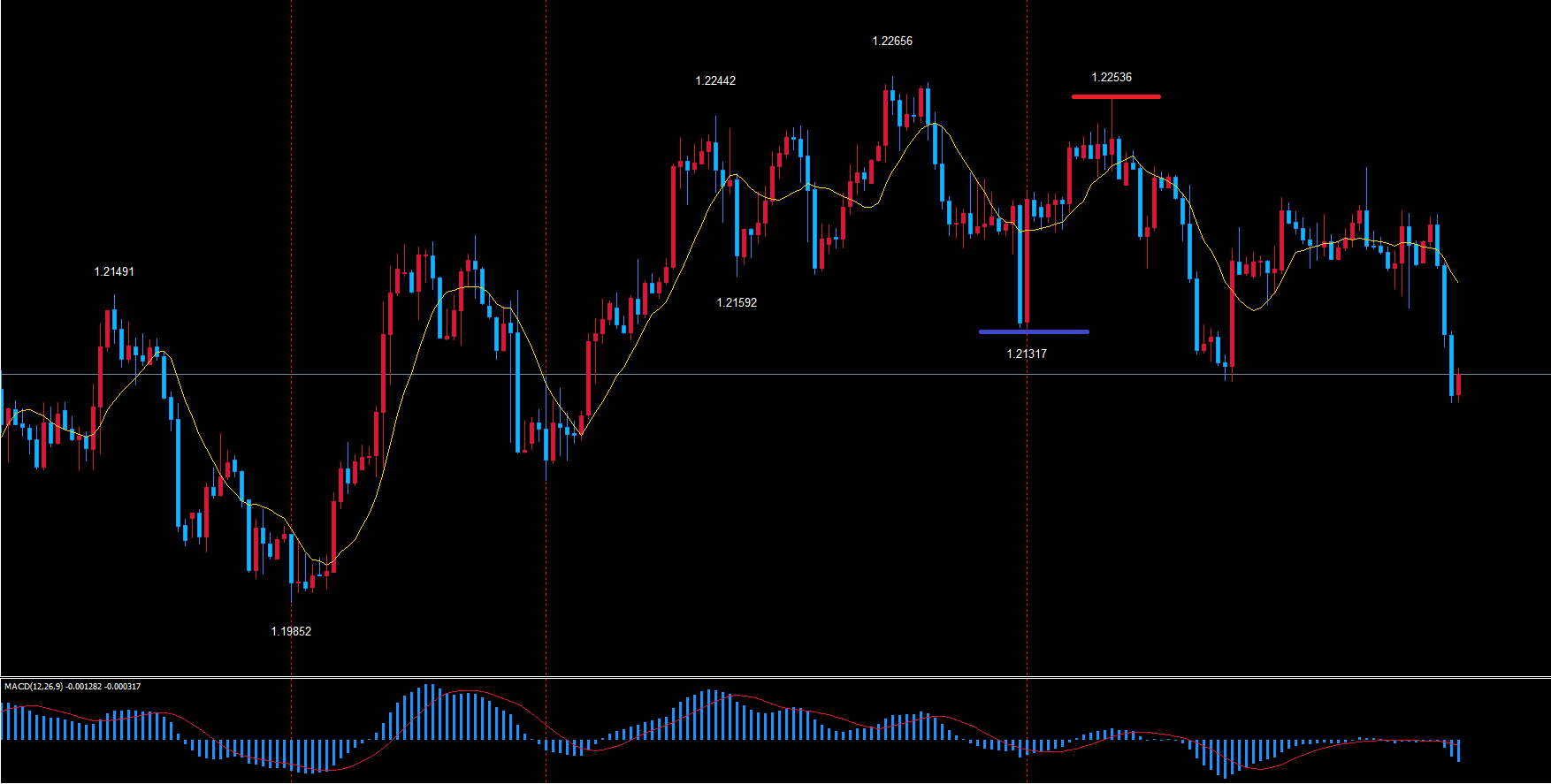 ユーロドル4時間サイクルは起点は青のライン1.21317が起点で現在62本目です。