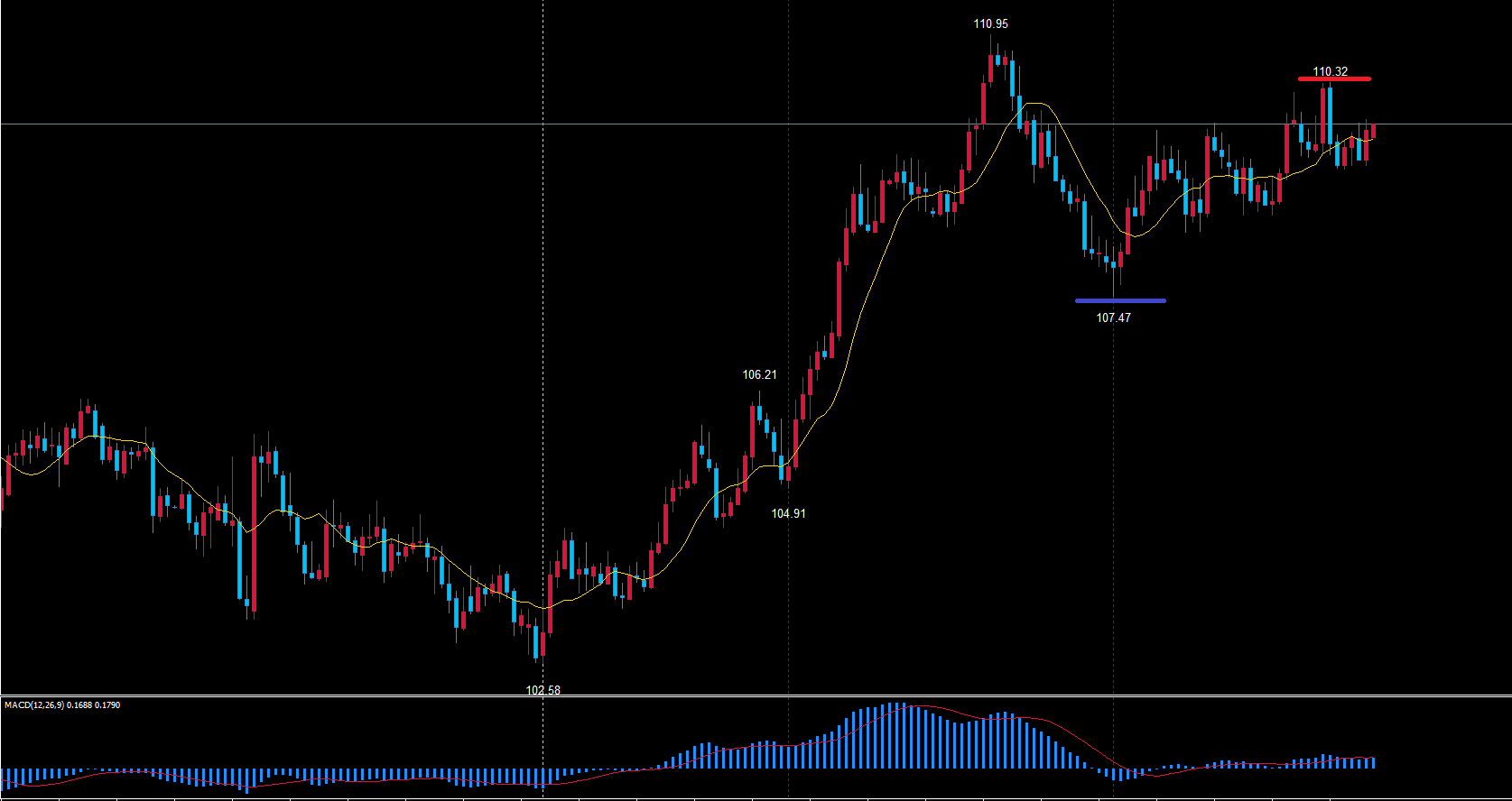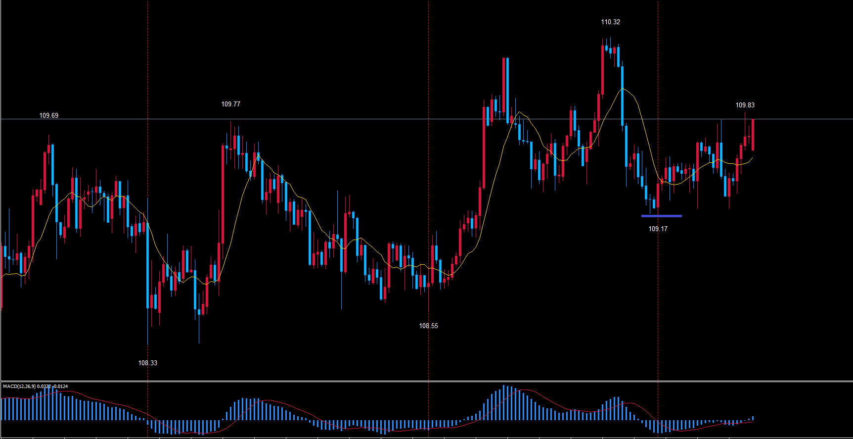 なので、現在は天井の赤のライン110.32から底へ向けて下落中で、ここからは底を疑いながら見ていきます。