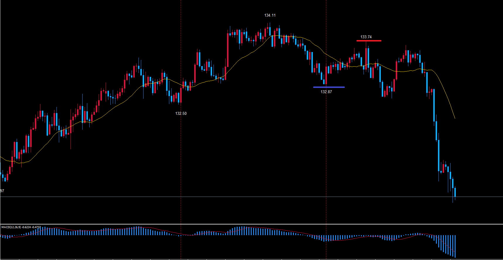 4時間サイクルは起点を割れた事でレフトトランスレーションが確定していて、天井は赤のラインの133.74という事が確定しています。