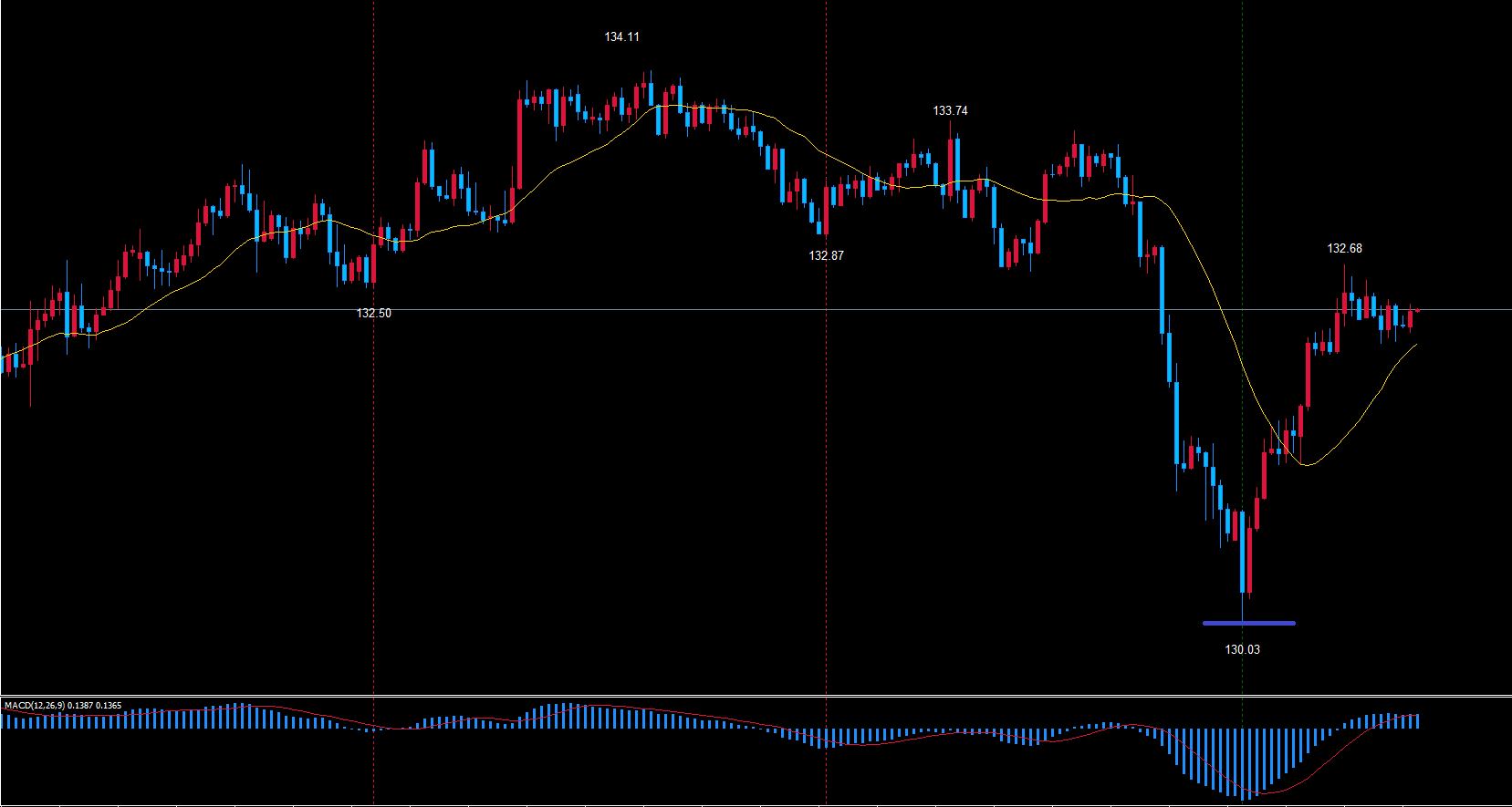 ただ、上位足の日足のサイクルも青のライン130.03で底を付けて反転している可能性があります。