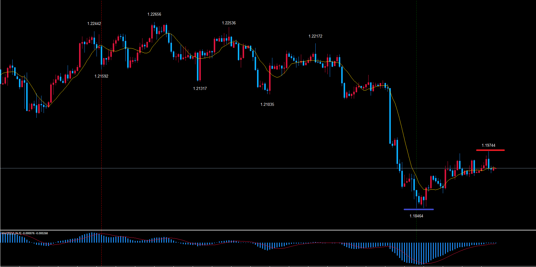ユーロドル4時間サイクルは起点の青のライン1.18464から34本目です。