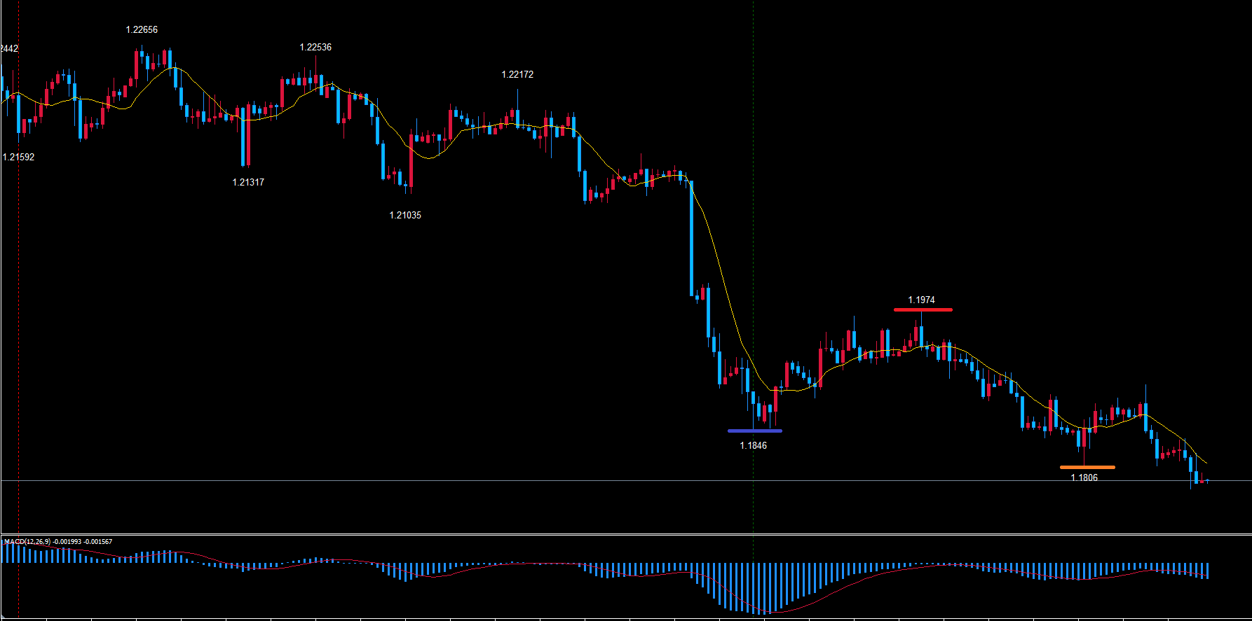 なので、直近の安値の黄色のライン1.1806で底を付けている事も考えられますが、