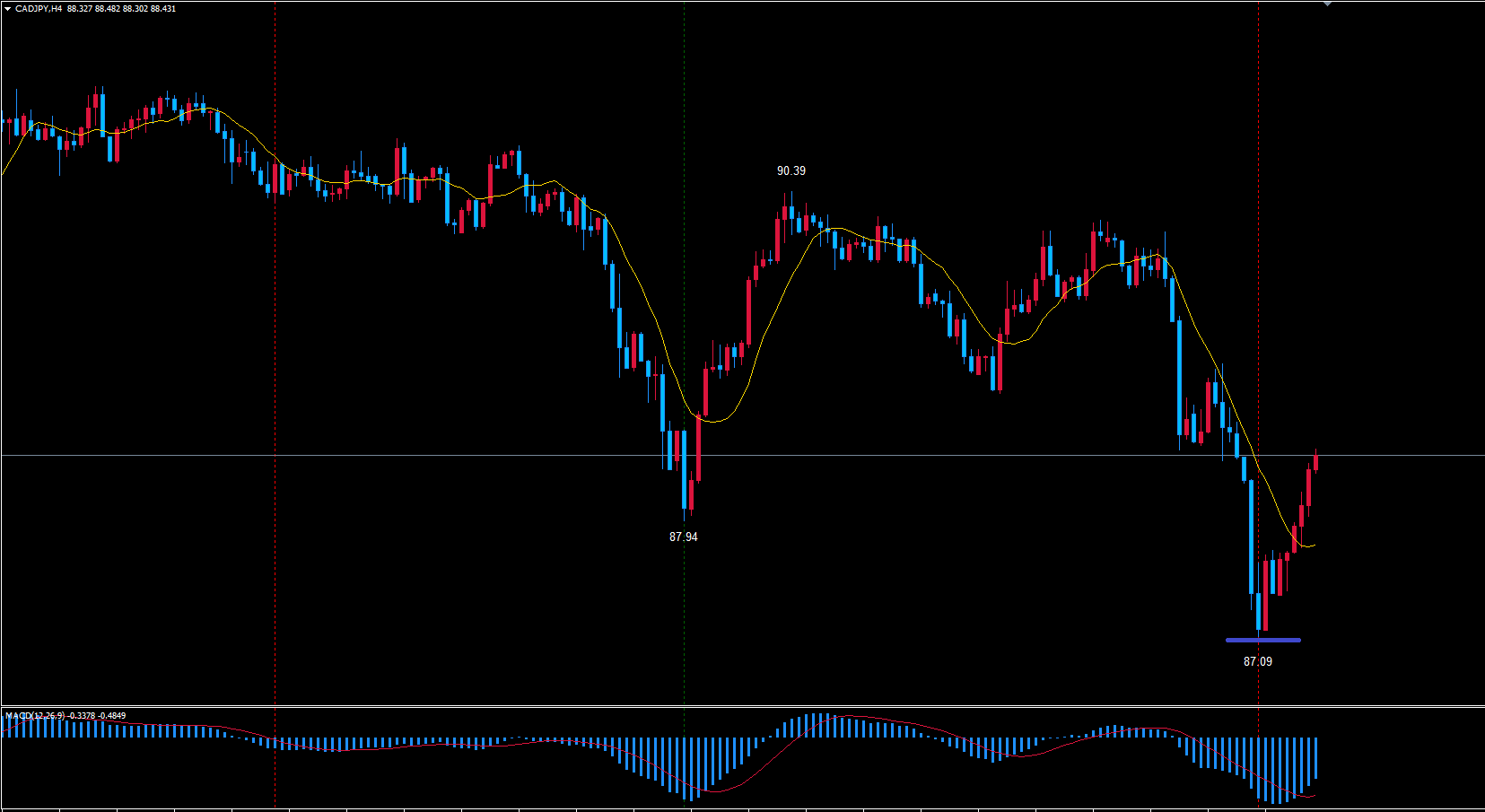 なので、ここからは90.39付近までの戻しはあっても超える事無く底まで続落の展開で見ています。