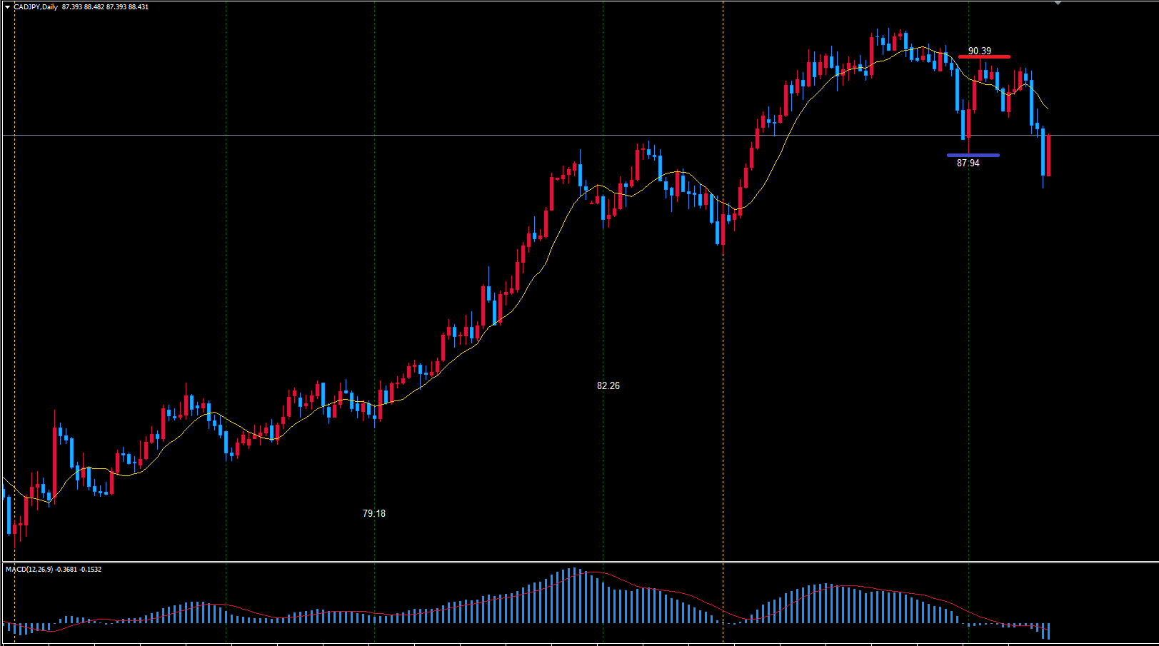 つまり、今回の日足サイクルは高値の赤のライン90.39で天井を付けている事になります。