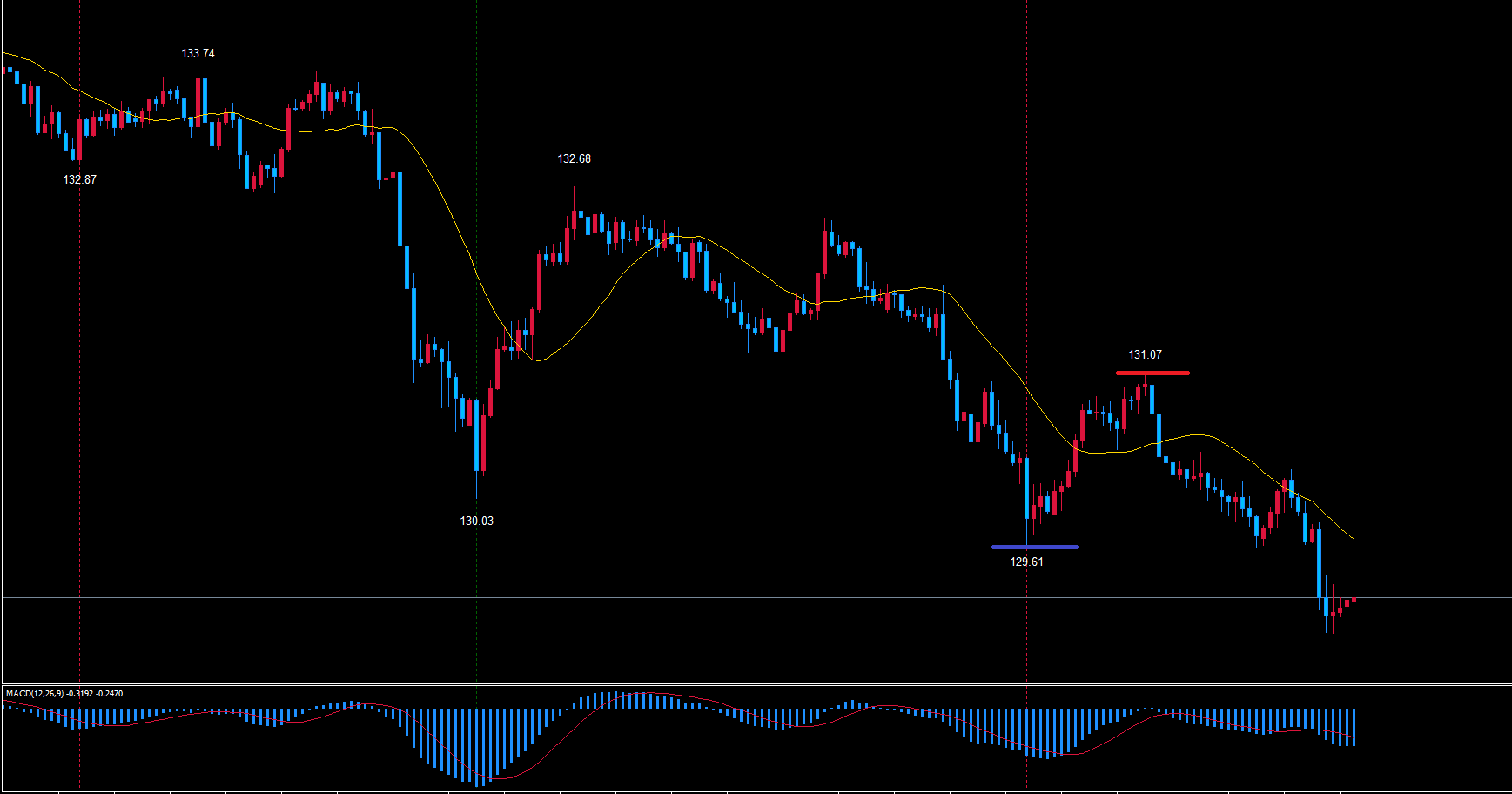 レフトトランスレーションが確定して、赤のライン131.07が天井、天井から底へ向けて下落中という状況で、