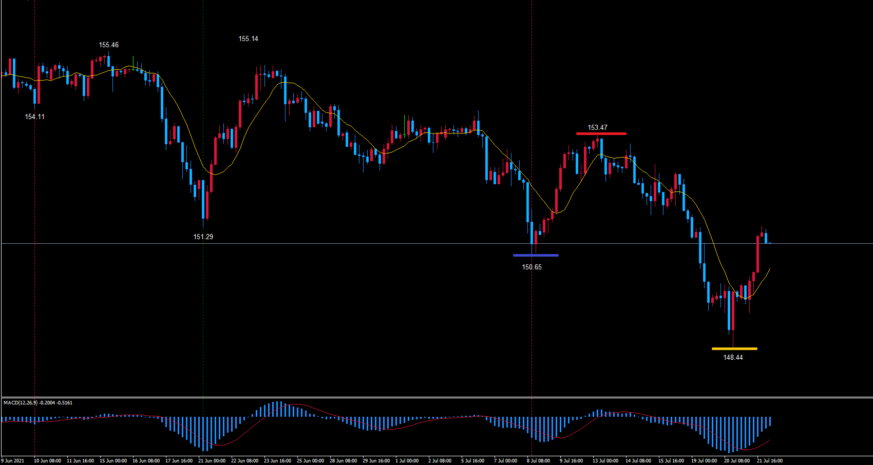 青のライン150.65から継続していても、これから底を付ける為に148.44を割れる必要がありますしね。