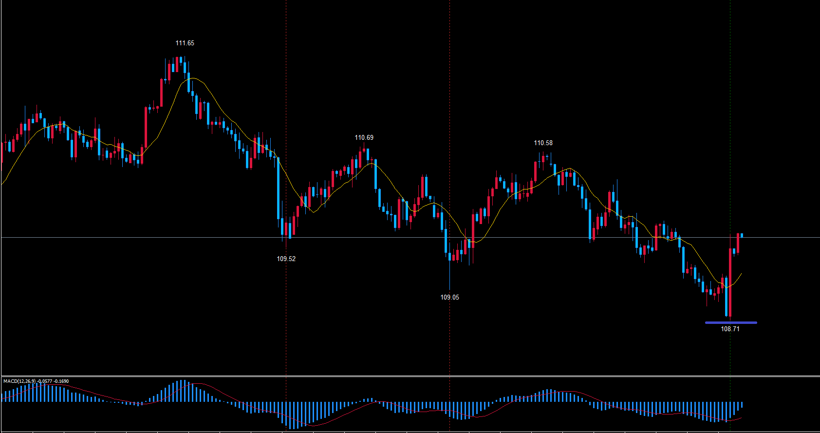 青のライン108.71は、更に週足サイクルでは31本目の安値になります。