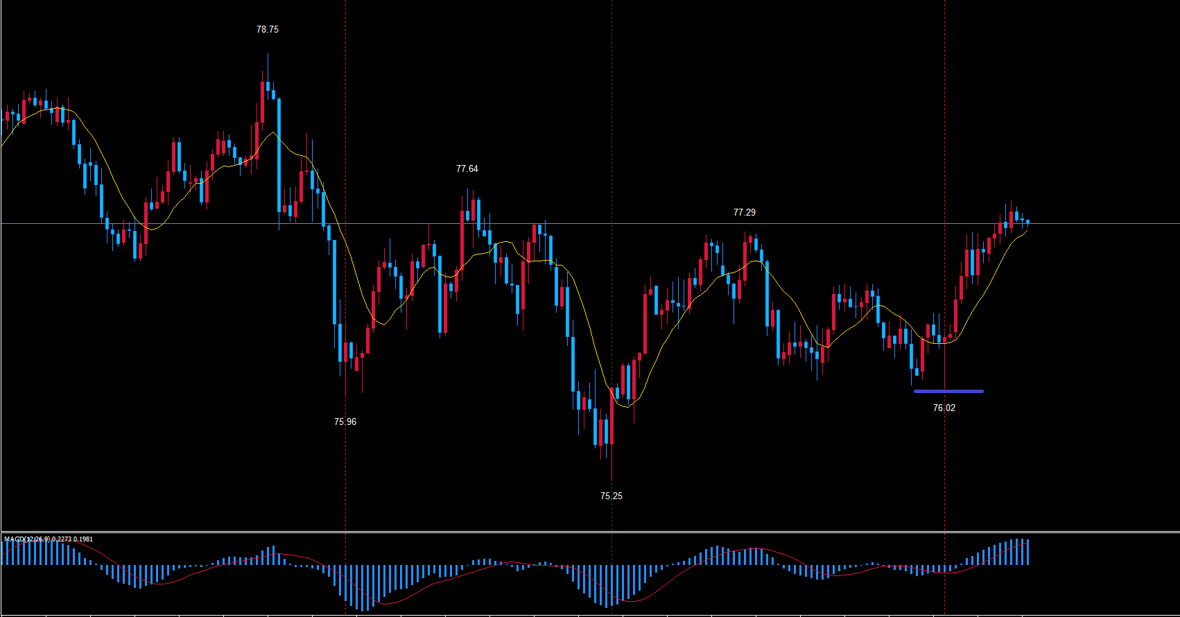 直近の安値の青のライン76.02で底を付けて反転していると見ています。
