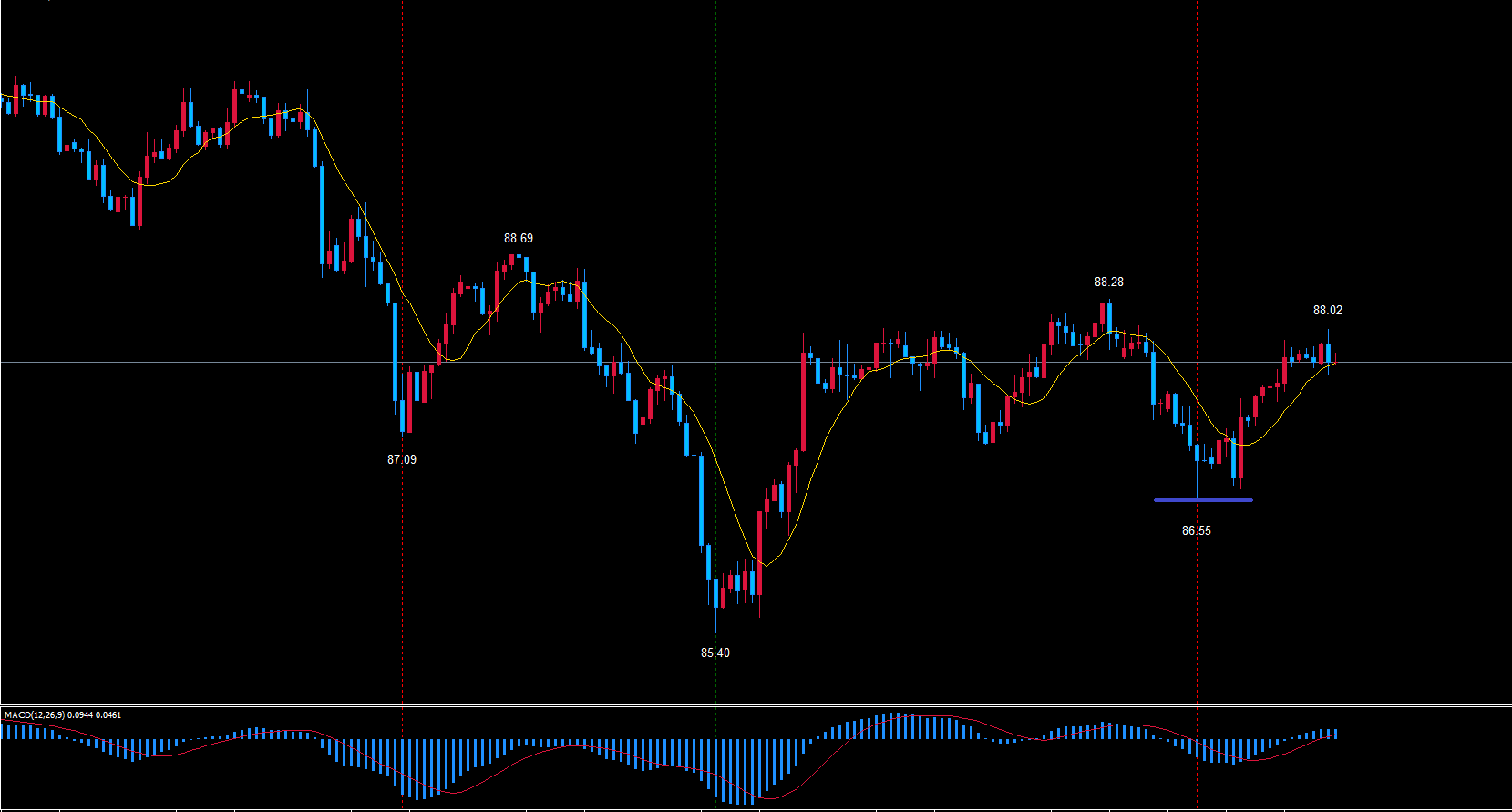 この状況を考えると、4時間サイクルは直近の高値88.02で天井を付けている可能性も考えられますが、